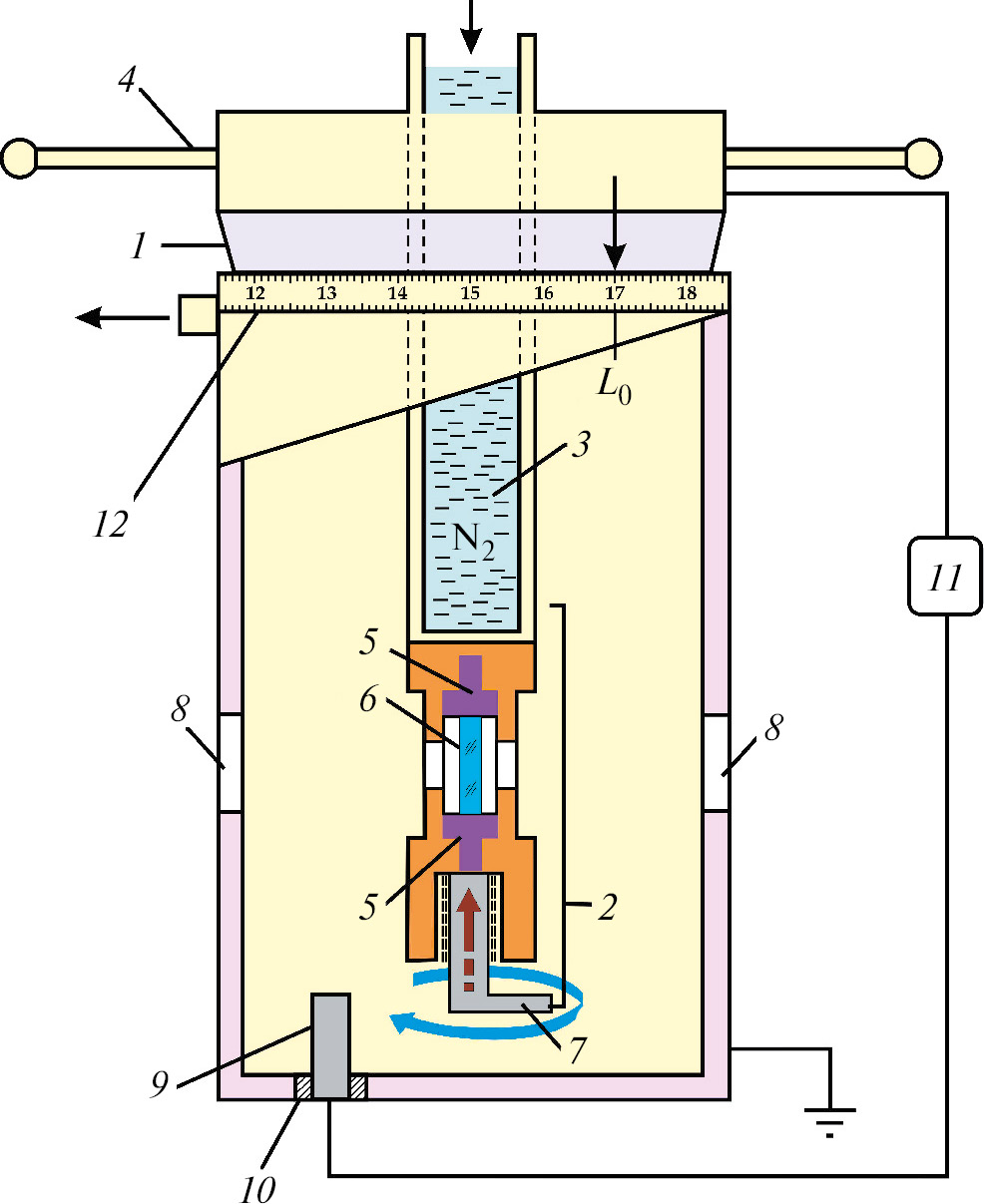 Рис. 3. Схема криостата для деформации кристаллов в диапазоне температур 85–400 К: 1 — шлиф, 2 — медный кристаллодержатель, 3 — резервуар для заливки жидкого азота, 4 — ручки для вращения головки криостата, 5 — специальные прижимные щечки, 6 — исследуемый монокристалл, 7 — сжимающий винт, 8 — окошки из LiF, 9 — стопор, 10 — прокладка из фторопласта, 11 — омметр, 12 — нониусная шкала (L).