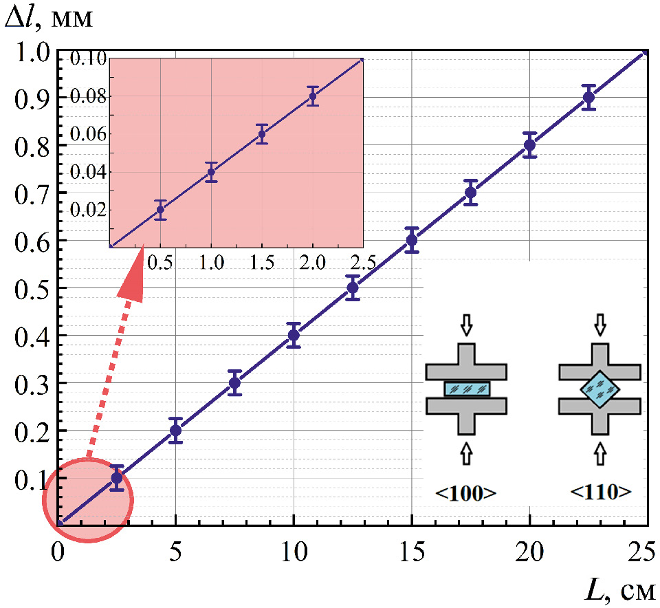 С этой целью разработан специальный криостат, который позволяет задать нужную степень относительной деформации и зафиксировать ее по выбранному кристаллографическому направлению <100> или <110> в широком интервале температур (85–400 К) в условиях высокого технического вакуума.