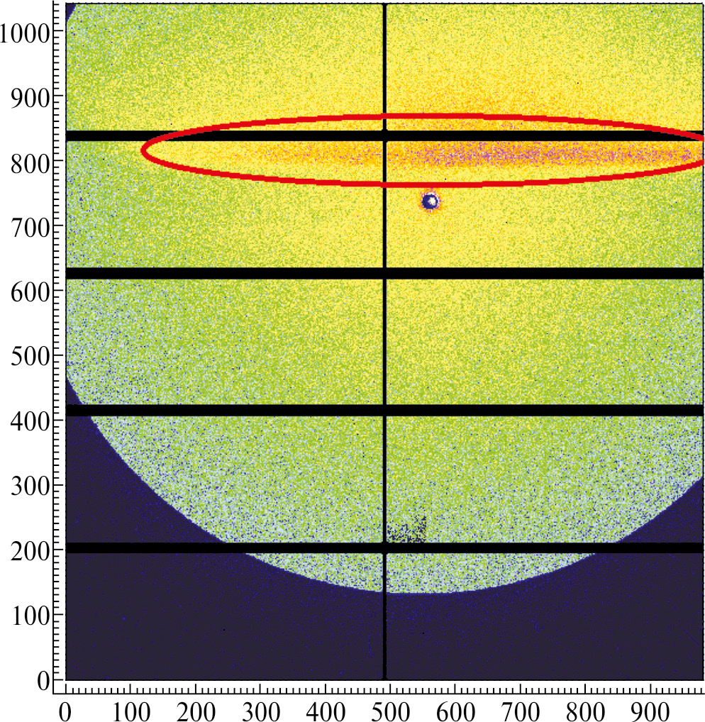 Рис. 2. Рентгенограмма рассеяния от пустого капилляра. Красным выделена засвеченная область от излучения, прошедшего мимо и сквозь стенки капилляра. Для усиления эффекта пучок слегка смещен по вертикали относительно оси капилляра.