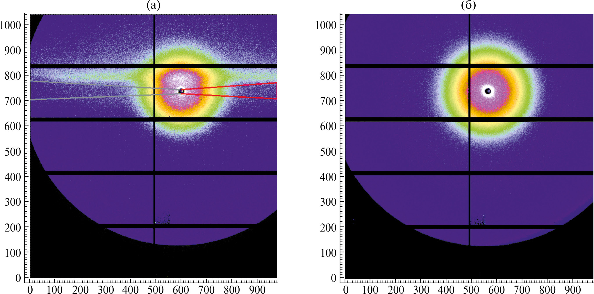 Рис. 3. Двумерные картины рассеяния растворов лизоцима с концентрацией 40 мг/мл в капилляре (а) и в ячейке с плоскопараллельными окнами (б). Красным выделена область интегрирования, не содержащая артефактов по всем углам рассеяния, серым — возможное расширение области интегрирования, оказавшееся нецелесообразным ввиду наличия нерабочего промежутка между регистрирующими блоками детектора.