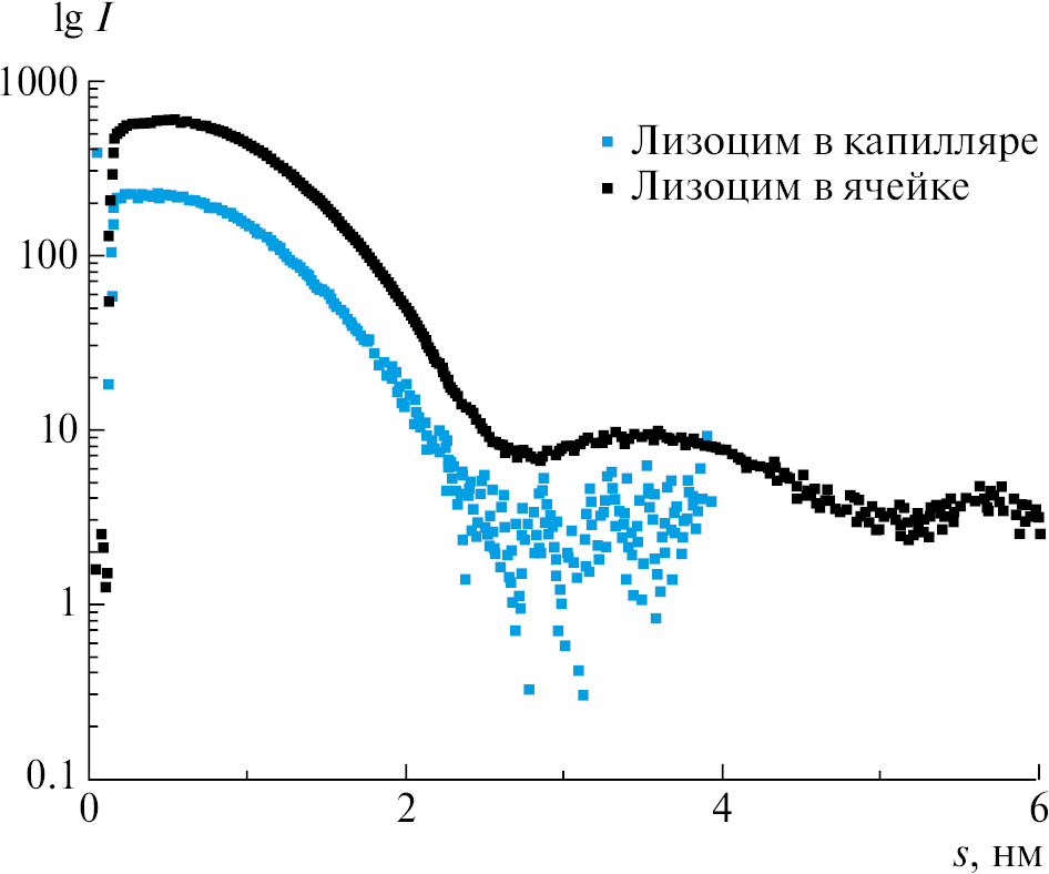 На рис. 4 показаны кривые МУРР от растворов лизоцима, полученные с использованием капилляра и ячейки.