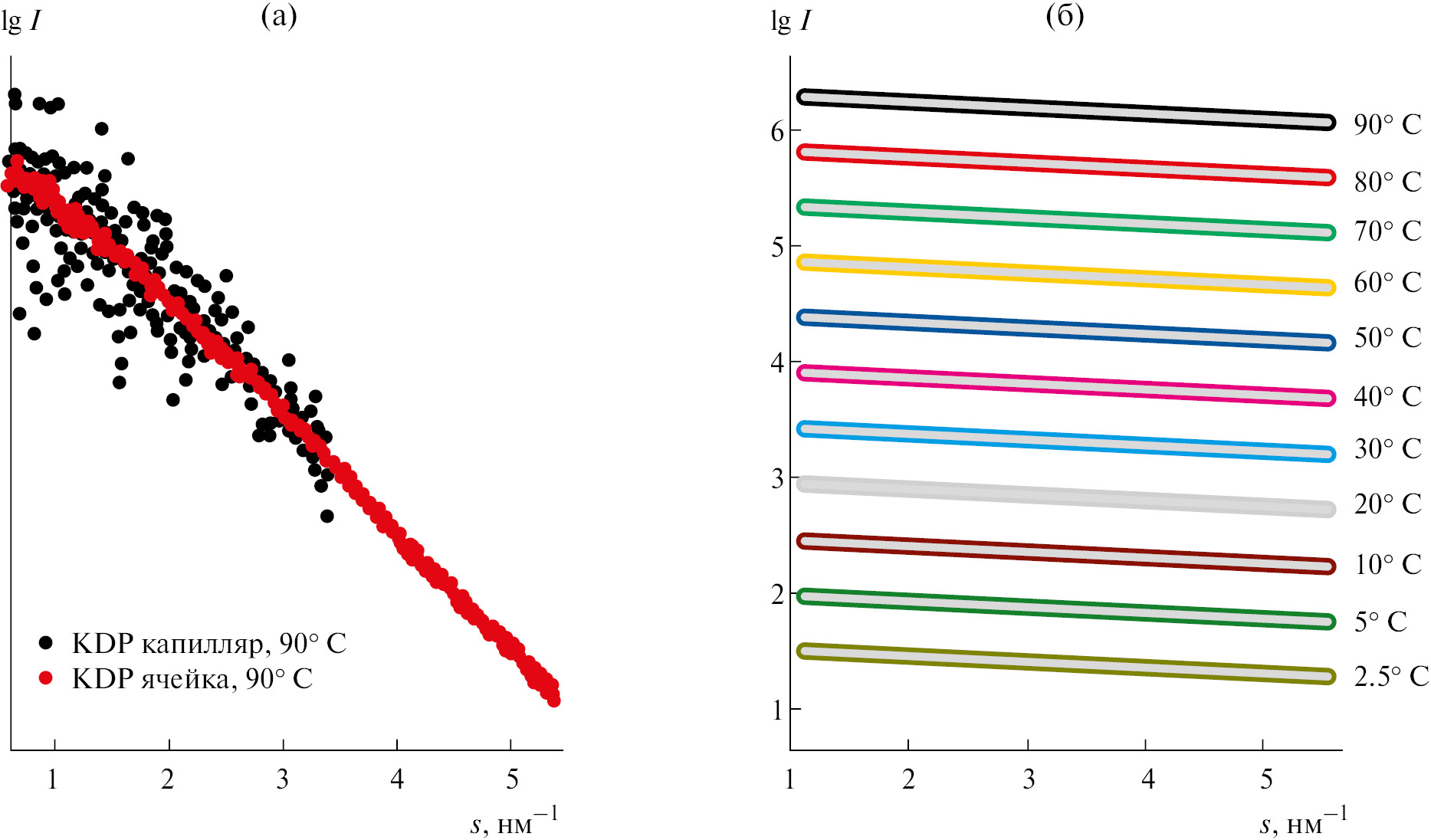 Рис. 5. Экспериментальные кривые МУРР для раствора KDP в капилляре (черная) и ячейке с плоскопараллельными окнами (красная) при температуре 90°С (a). Экспериментальные и рассчитанные программой OLIGOMER модельные кривые МУРР для раствора KDP показаны при температурах от 90 до 2.5°С (б). Кривые смещены по вертикали для лучшей визуализации.