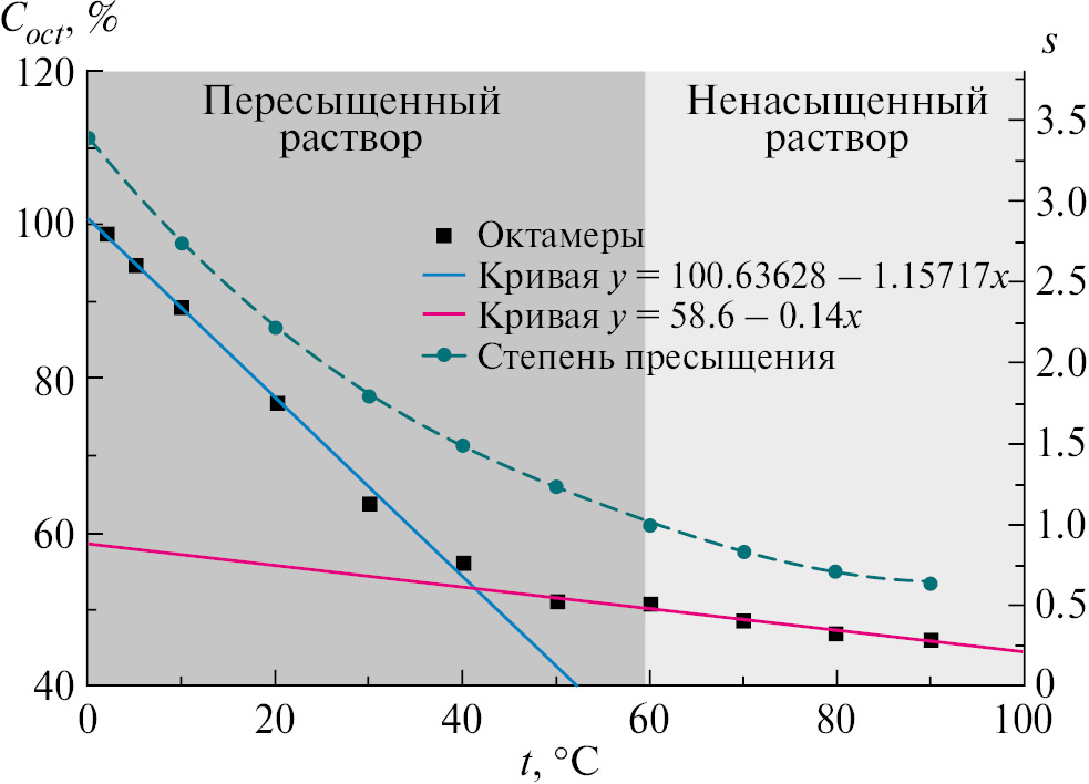 Рост содержания октамеров более медленный на участке температур от 90 до 50°С (он описывается линейной функцией y = 58.6 – 0.14x) по сравнению с участком от 40 до 2.5°С, где содержание октамеров возрастает значительно быстрее. На данном участке зависимость описывается линейной функцией y = 100.63628 – 1.15717x. Раствор KDP с концентрацией 501 мг/мл является насыщенным при температуре 60°С [20]. Из пересыщенных растворов KDP происходит рост тетрагональных кристаллов. Концентрация октамеров начинает быстрее возрастать при переходе от насыщенного к пересыщенному раствору, начиная со степени пересыщения s = 1.5, где и должен происходить рост кристаллов. Данное значение пересыщения соответствует температуре 40°С. Такое поведение октамеров хорошо соответствует именно поведению кристаллообразующих кластеров при возникновении благоприятных условий для их роста. В противном случае мы бы наблюдали плавное увеличение концентрации октамеров, соответствующее изменению степени пересыщения.