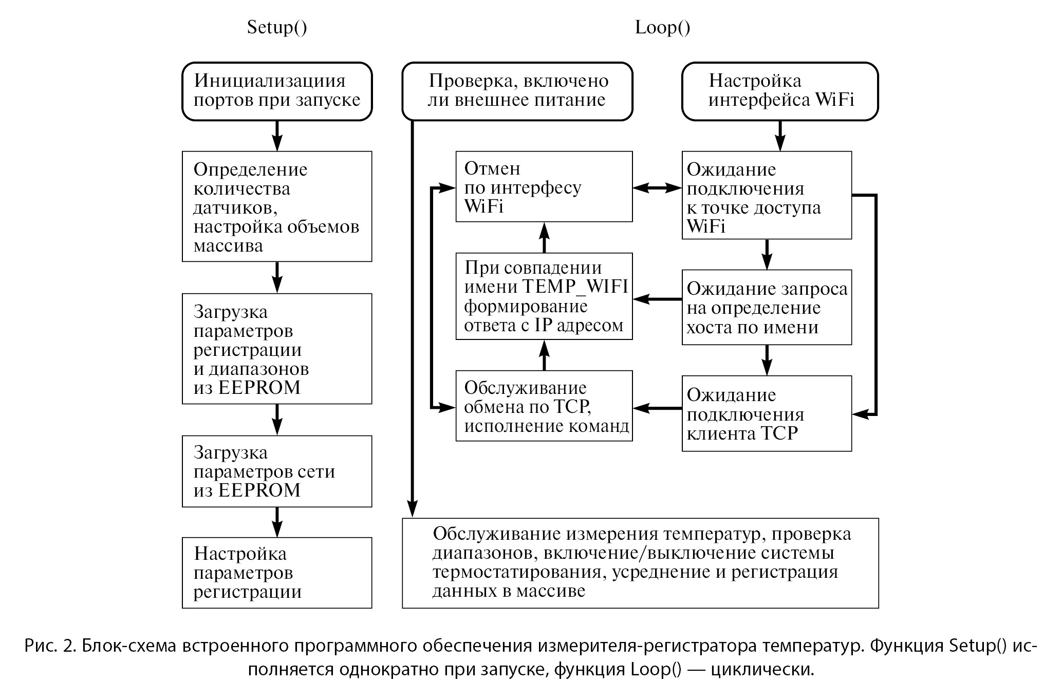 Рис. 2. Блок-схема встроенного программного обеспечения измерителя-регистратора температур. Функция Setup() исполняется однократно при запуске, функция Loop() — циклически.