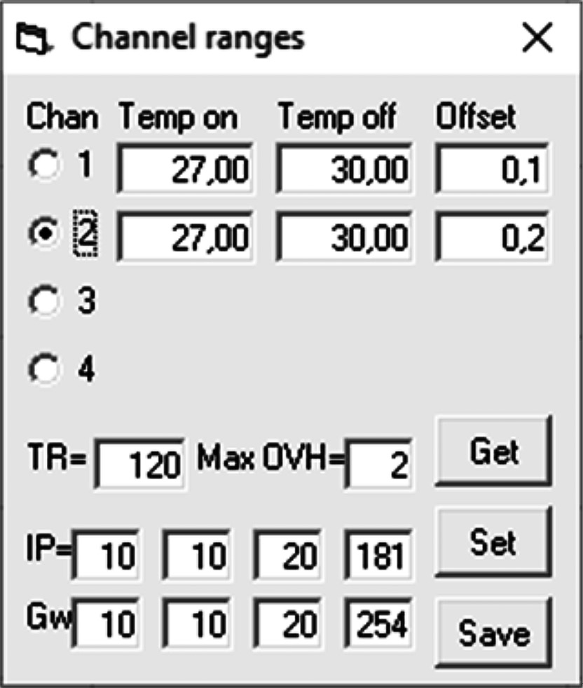 Рис. 4. Окно для настройки диапазонов датчиков (Temp on, Temp off), смещений по калибровке (Offset) и параметров регистрации после запуска.