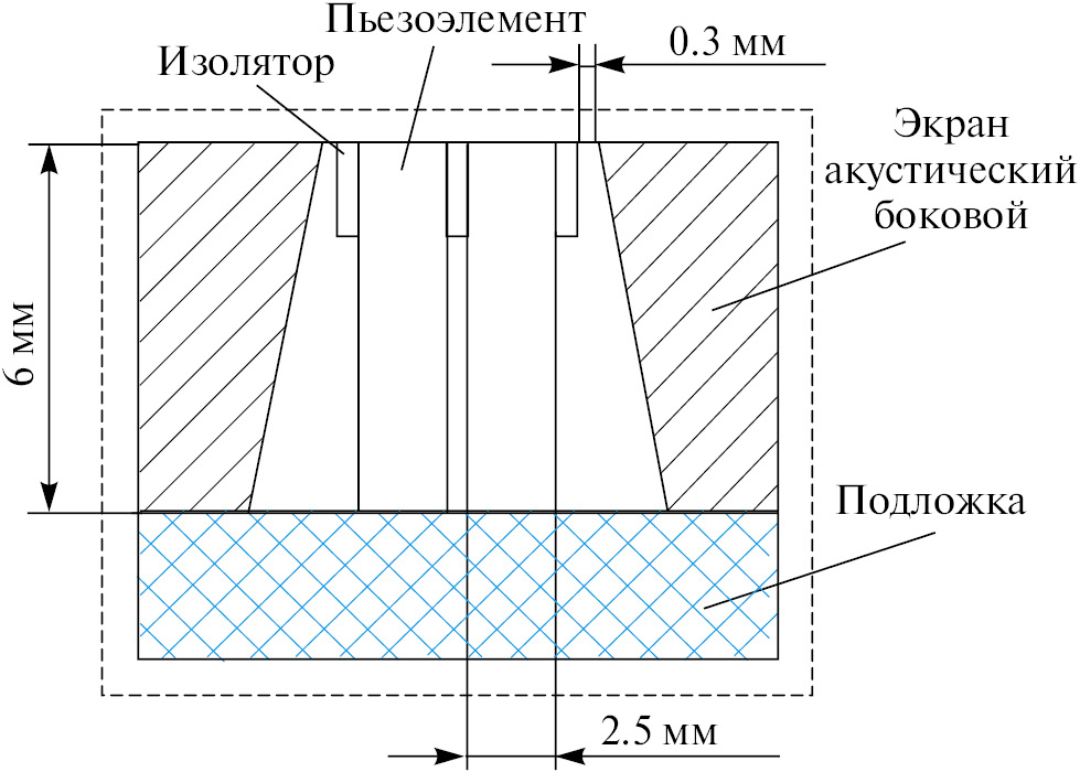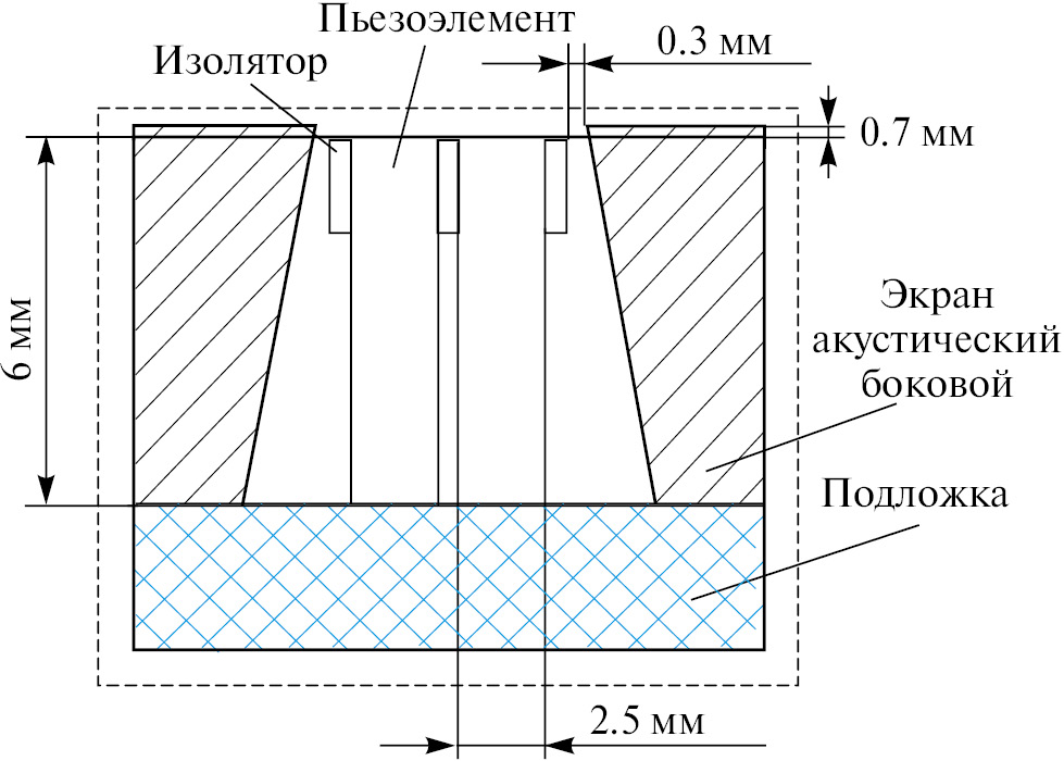 Рис. 3. Эскиз макета № 2 антенны ГБО (боковые акустические экраны на 0.7 мм ниже поверхности пьезоблока).
