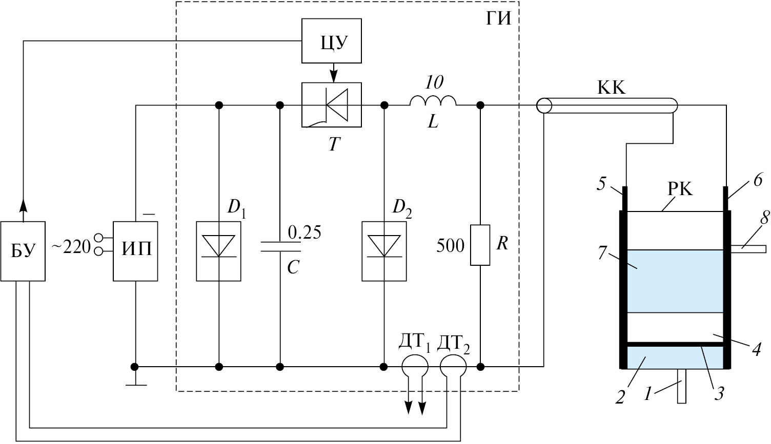 Электрическая схема разработанного устройства приведена на рис. 1. Она содержит генератор высоковольтных импульсов (ГИ) и разрядную камеру (РК). ГИ выполнен на основе накопительного конденсатора С, индуктивности L и блока последовательно соединенных тиристоров Т. Источник питания (ИП) осуществляет зарядку конденсатора. Напряжение зарядки имеет отрицательную полярность и плавно регулируется до 10 кВ. Для запуска тиристоров блока Т используется высокоэффективная трансформаторная цепь управления (ЦУ), рассмотренная в работе [5]. Коаксиальный кабель (КК) обеспечивает подключение ГИ к электродам 5, 6 камеры РК. Блок управления (БУ) формирует импульсы запуска цепи управления.