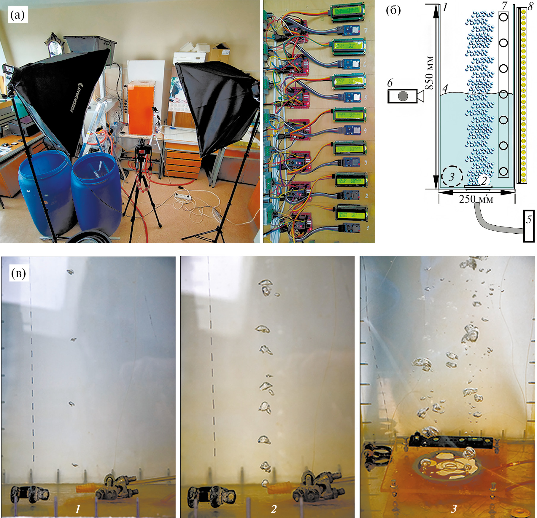 Рис. 1. а) Фотографии разработанного стенда. б) Принципиальная схема экспериментального стенда: 1 — камера экспериментального стенда, 2 — система генерации всплывающих пузырьков, 3 — патрубок для слива или подачи жидкостей в рабочую зону экспериментального стенда, 4 — граница раздела жидкостей разной плотности, 5 — система подачи газовой смеси с регулируемым расходом вещества, 6 — система видеорегистрации, 7 — технические отверстия для отбора проб и установки датчиков температуры и электропроводности (солености), 8 — светодиодные осветители. в) Пример генерации всплывающих пузырьков в виде одиночных пузырьков (1), непрерывной цепочки (2), массированного выброса (3).