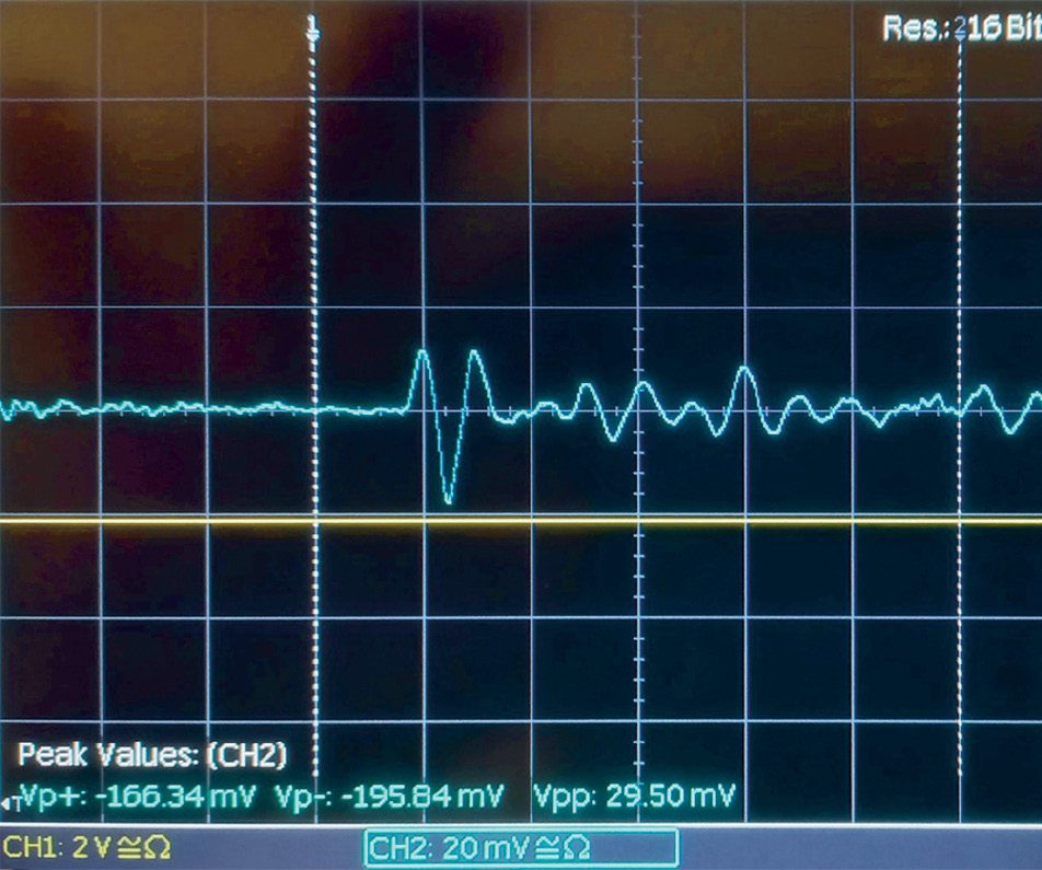 Рис. 4. Типичный сигнал пьезоэлектрического приемника в оптоакустическом режиме на экране осциллографа.