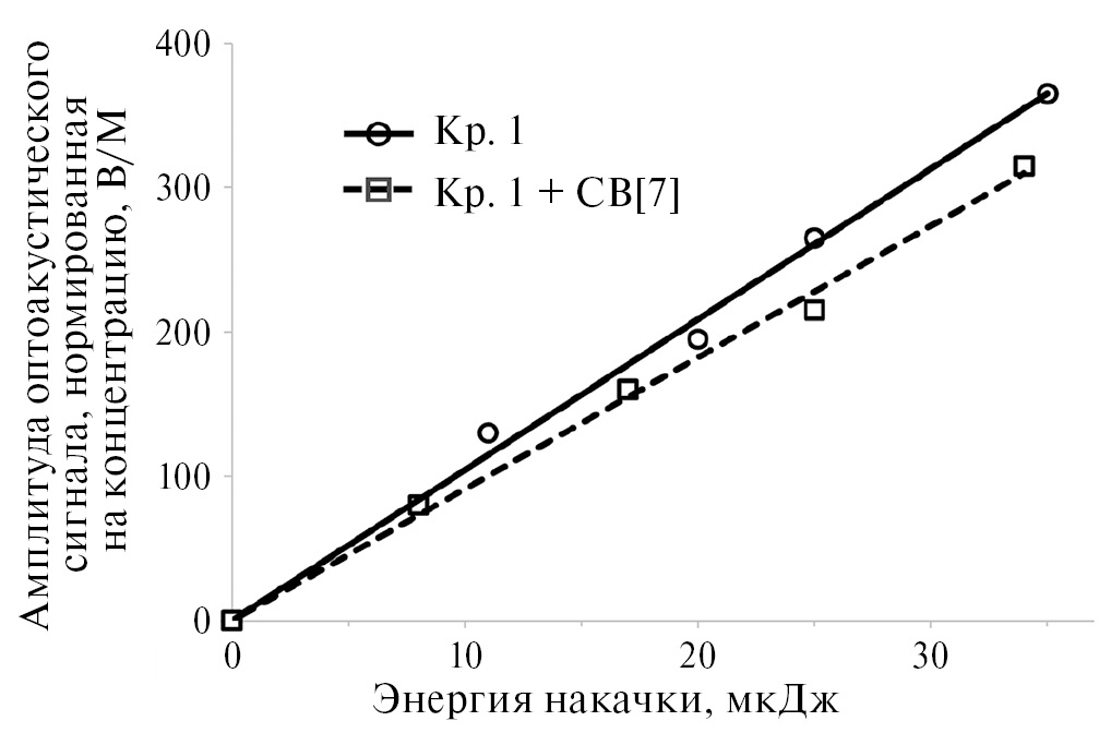 Видно, что в пределах точности измерений две линейные зависимости практически не различаются, что указывает на то, что безызлучательная часть потерь энергии импульса накачки слабо зависит от наличия комплекса с кукурбитурилом CB[7], т. е. введение последнего влияет преимущественно на потери, связанные с излучательной релаксацией. Полученный результат находится в согласии с тем фактом, что квантовый выход флуоресценции красителя Кр.1 довольно низок (0.0025). Согласно результатам работы [9], добавление в раствор кукурбитурила CB[7] практически не изменяет эффективность безызлучательного канала релаксации, при том что квантовый выход флуоресценции увеличивается приблизительно в 5 раз. Кроме того, методами пикосекундной флуорецентной спектроскопии ранее было показано, что кукурбитурил CB[7] вмешивается в процесс сольватации (гидратации) красителя Кр.1 [10]. При фотовозбуждении краситель за счет кулоновских сил, возникающих при внутримолекулярном фотопереносе электрона, вдвигается в полость CB[7] за времена порядка нескольких пикосекунд, что, в принципе, могло бы уменьшить оптоакустический сигнал. Однако мы не наблюдали существенного уменьшения, по-видимому, ввиду того, что характерное время колебательного охлаждения имеет порядок 100 фс, что существенно меньше времени структурных изменений комплекса включения.