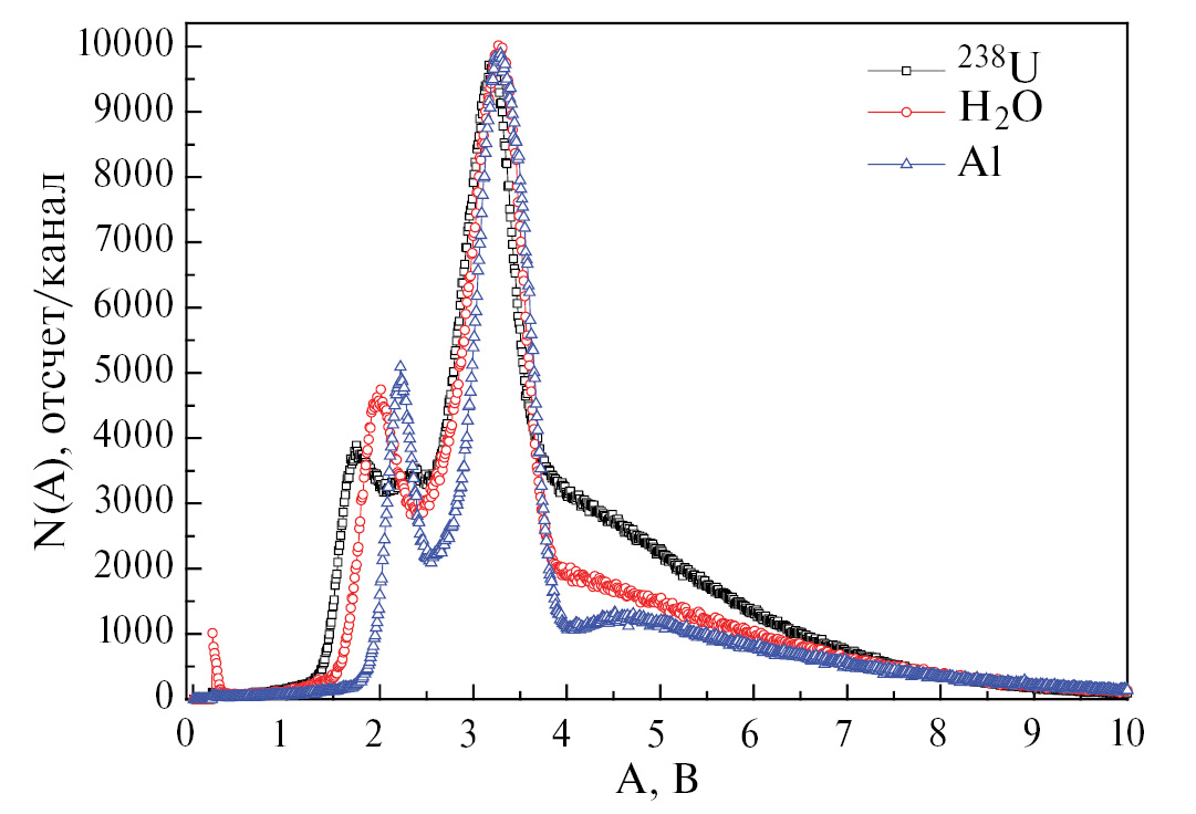 Рис. 5. Амплитудные распределения нейтронов, измеренные с помощью 3He-спектрометра во время сеанса облучения образцов-мишеней 238U, воды, обогащенной по изотопу 18O, и Al. Ширина канала равна 0.01 В.