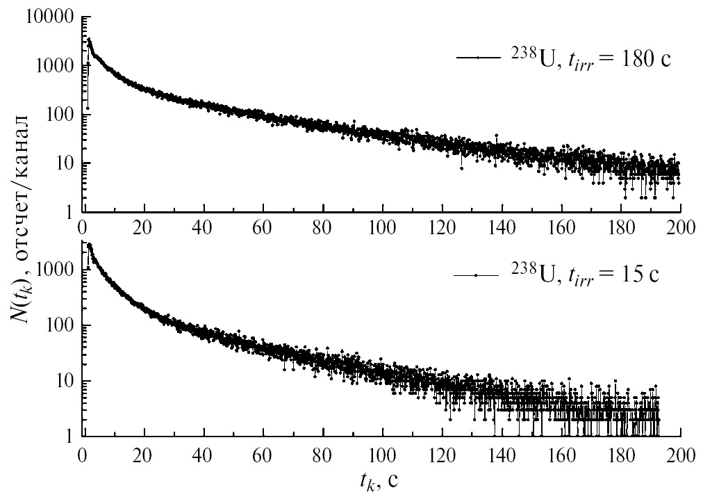 В настоящем эксперименте неколлимированный пучок протонов использовался в основном для изучения временных распределений запаздывающих нейтронов на тяжелых ядрах: 232Th, 235U и 238U. Следует отметить, что несмотря на мощную защиту (бетонный блок толщиной 1 м), используемую в настоящем эксперименте, эффект блокировки нейтронного детектора не удалось устранить полностью. Поэтому для введения поправки с целью учесть данный эффект использовалась процедура, описанная выше для случая стационарно установленных мишеней. На рис. 7 показаны кривые спада нейтронной активности, измеренные на ядрах мишени 238U при двух значениях времени облучения образцов: 15 и 180 с. В представленные данные внесена поправка на эффект блокировки детектора. Детальный анализ экспериментальных данных, полученных для мишени 238U, описан в работе [10]. В качестве иллюстрации к настоящему методу ниже приводятся результаты анализа кривых спада нейтронной активности образца 238U, представленные в работе [10].
