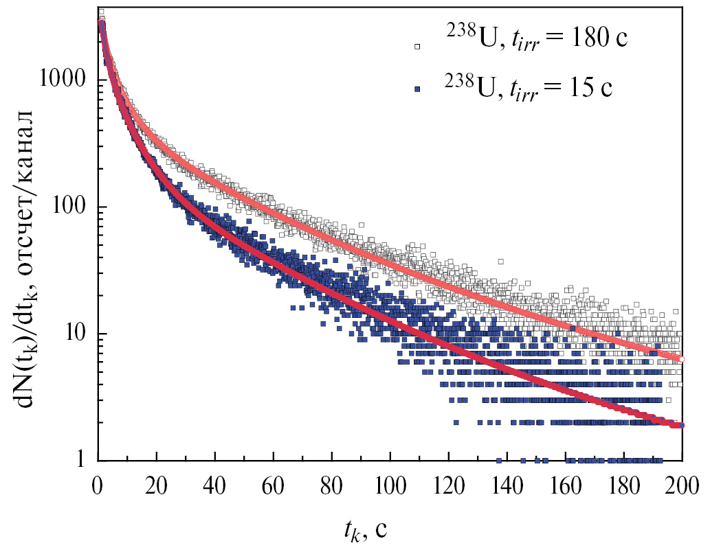 Рис. 8. Результаты оценки временных параметров запаздывающих нейтронов. Точки – экспериментальные данные. Кривые получены в результате оценки временных параметров запаздывающих нейтронов [10].