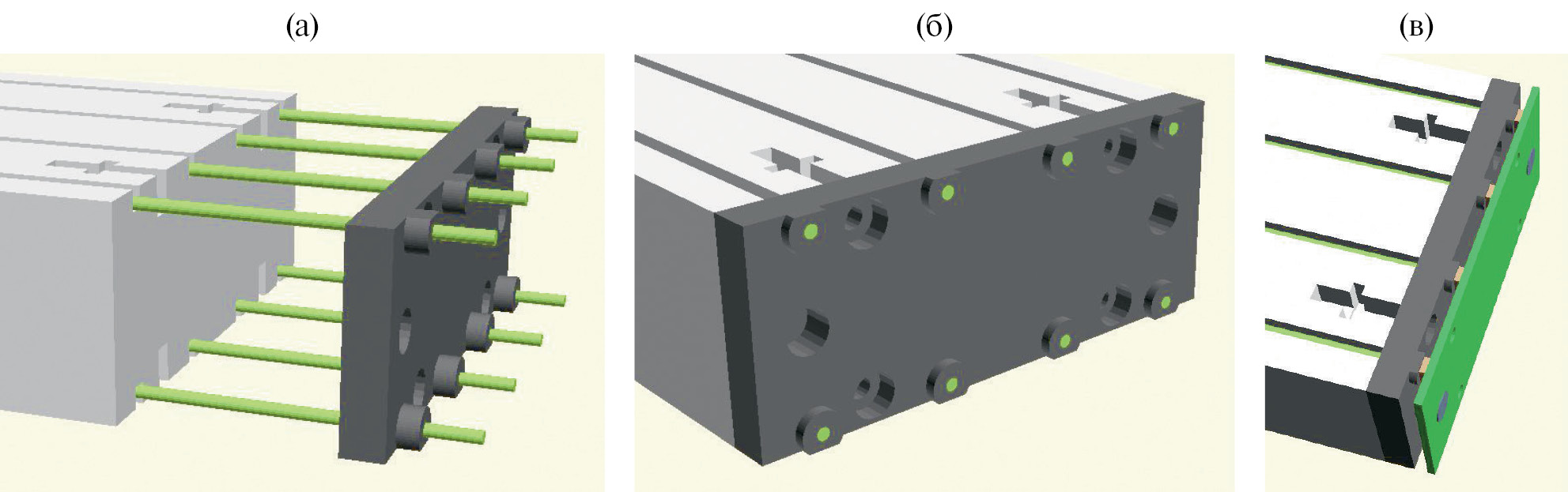 Чувствительное окно КФУ имеет форму квадрата со стороной 1.3 мм, в то время как диаметр волокна составляет 1.2 мм. Смещение волокна более чем на 50 мкм от центра чувствительного окна приводит к потерям света. Автоматизированная технология монтажа КФУ на печатную плату обеспечивает относительную точность установки около 25 мкм. Аналогичная точность достижима при изготовлении оптического коннектора. В теле коннектора предусмотрены центрирующие отверстия (видны на рис. 6б), имеющие такое же расположение относительно центров волокон, как аналогичные отверстия в плате КФУ по отношению к центрам их чувствительных окошек. Прецизионное совмещение платы с оптическим коннектором осуществляется при помощи специального направляющего устройства. Плата с КФУ устанавливается на штыри направляющего устройства, которые затем совмещаются с центрирующими отверстиями коннектора. Через отверстия в теле направляющего устройства плата вместе с коннектором фиксируется на теле стрипа четырьмя винтами, после чего направляющее устройство удаляется. Одна сторона полностью снаряженного стрипа изображена на рис. 6в (не показаны винты крепления, а штыри направляющего устройства показаны условно, без самого устройства).