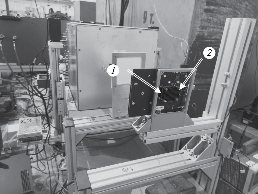 Рис. 3. Тестовый стенд для облучения протонами концентратора данных. Отмечены: 1 ─ ось пучка протонов, 2 ─ ПЛИС на плате концентратора.