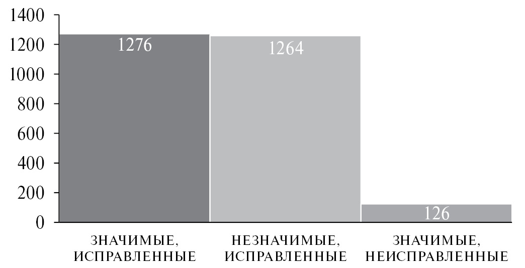Процедура тестирования была разделена на 13 этапов с различной длительностью набора и интенсивностью пучка. Интенсивность варьировалась в диапазоне от 1.5 ∙ 104 частиц/(с ∙ см2 ) до 1.5 ∙ 106 частиц/(с∙см2 ). Суммарное время облучения составило 40 ч, во время которых 5.7 ∙ 1011 протонов прошло через микросхему. Всего было зарегистрировано 2666 сбоев, из которых 126 было невозможно исправить аппаратно-программными методами коррекции (многократные сбои). Количество зарегистрированных сбоев и их классификация по типам представлены на рис. 4. Видно, что половина сбоев являются “незначимыми”, т. е. сбои произошли в битах, не влияющих на исполнение микропрограммы ПЛИС.