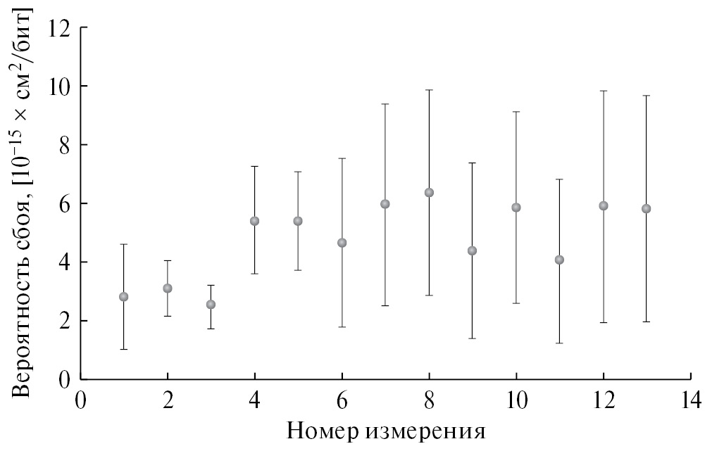 На рис. 5 представлены оценки вероятности сбоя ячейки конфигурационной памяти микросхемы Artix-7 XQ7A200T, рассчитанные по формуле (1) в отдельности для каждого из тринадцати испытаний, проведенных во время эксперимента. Погрешность определяется количеством накопленных сбоев, точностью измерения числа протонов, прошедших через микросхему во время данного тестирования, и в меньшей степени неоднородностью пучка.