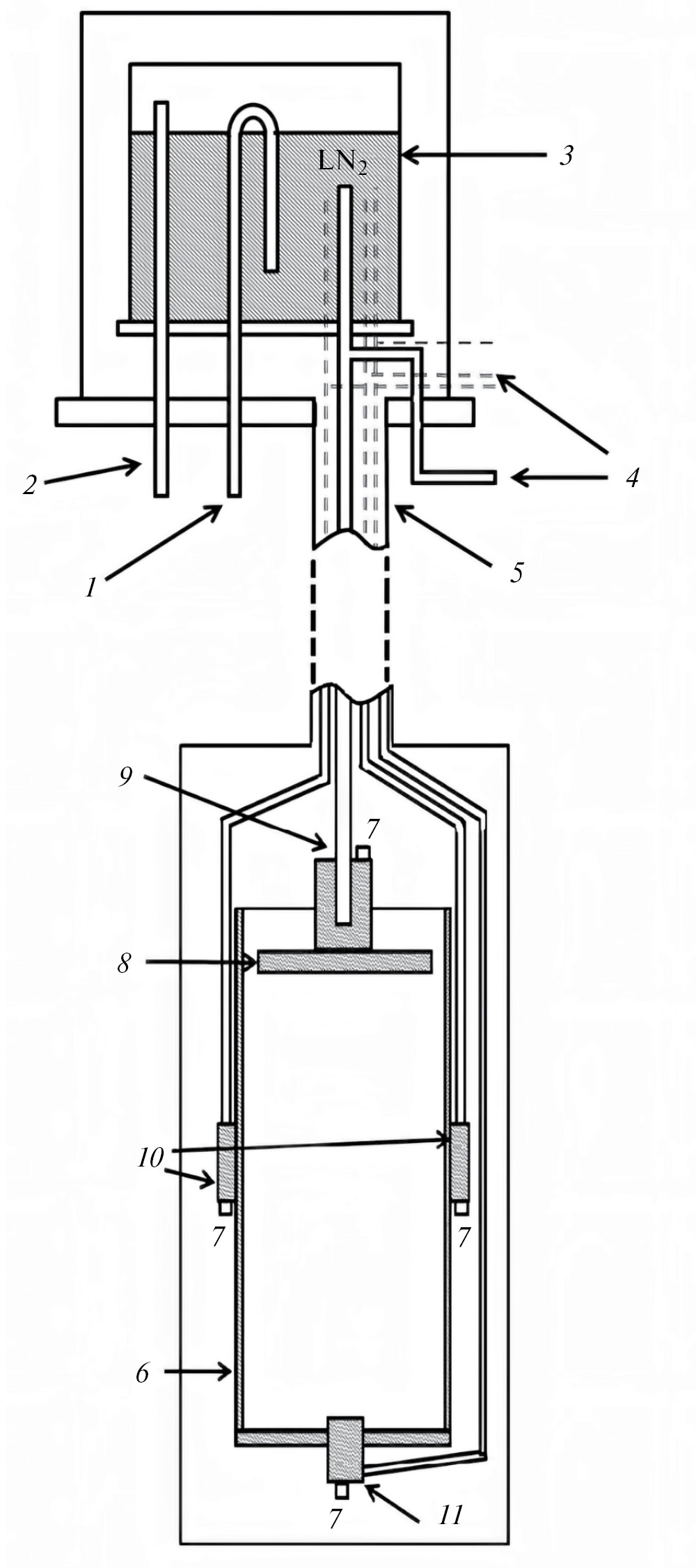 Рис. 2. Схема термосифонной системы криостатирования детектора РЭД-100 [2]: 1 – трубка заливки жидкого азота в резервуар 3 , 2 – вентиляционная трубка, 3 – резервуар с жидким азотом, 4 – трубки для заполнения термосифонов газообразным азотом, 5 – вакуумированный металлорукав с трубчатыми термосифонами, 6 – охлаждаемый внутренний сосуд криостата, 7 – термодатчики, 8 – верхний теплообменник, 9 – термосифон ТС-1, 10 — теплообменники боковых термосифонов ТС-3 и ТС-4, 11 – теплообменник нижнего термосифона ТС-2, 12 – внешний кожух криостата детектора.