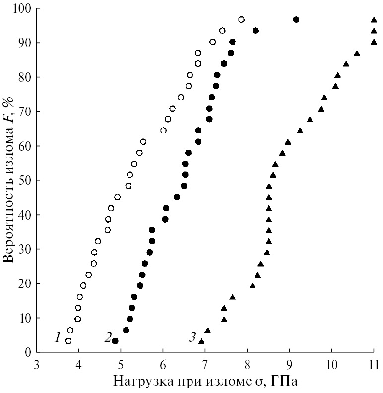 Рис. 3. Результаты измерения предела прочности для ОВ типов 1, 2 и 3. Цифры у точек кривых соответствуют типам ОВ, измерениям прочности которых они отвечают.