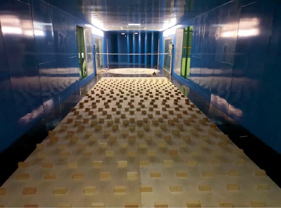 Характеристики ветрового потока в пограничном слое атмосферы определяются профилем средней скорости ветра, интенсивностью турбулентности и интегральным спектром мощности ветра [3–5]. Идеальным методом моделирования пограничного слоя атмосферы в аэродинамической трубе является создание турбулентного пограничного слоя за счет естественной шероховатой поверхности, но этот метод требует протяженной рабочей зоны аэродинамической трубы. Наличие протяженной рабочей зоны (18.9 м) характеризирует аэродинамическую трубу НИУ МГСУ.