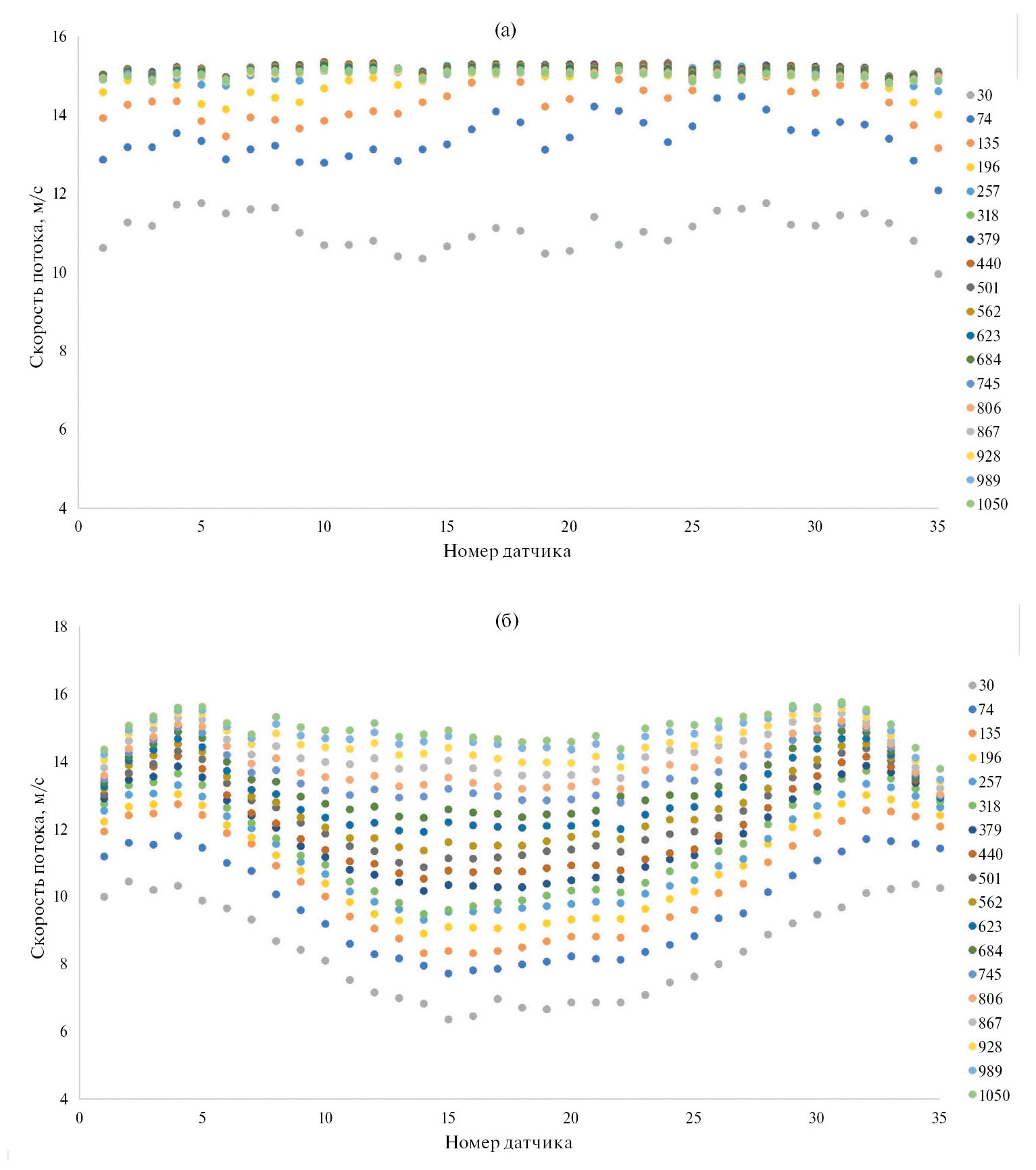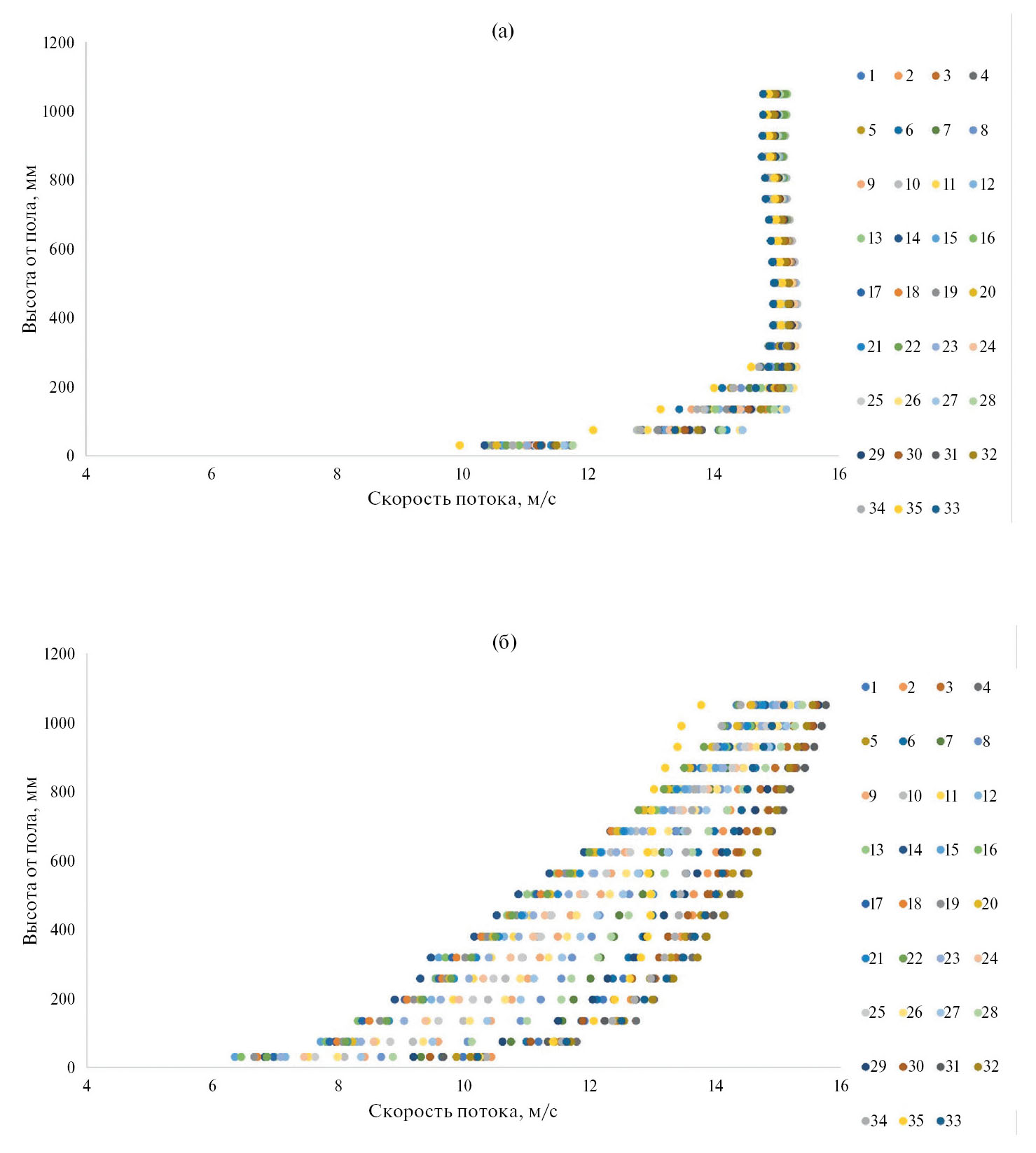 Рис. 4. Зависимость скорости от номера датчика для различных высот: для пустой трубы (а) и для трубы с аэродинамическими сопротивлениями и турбулизаторами (б).