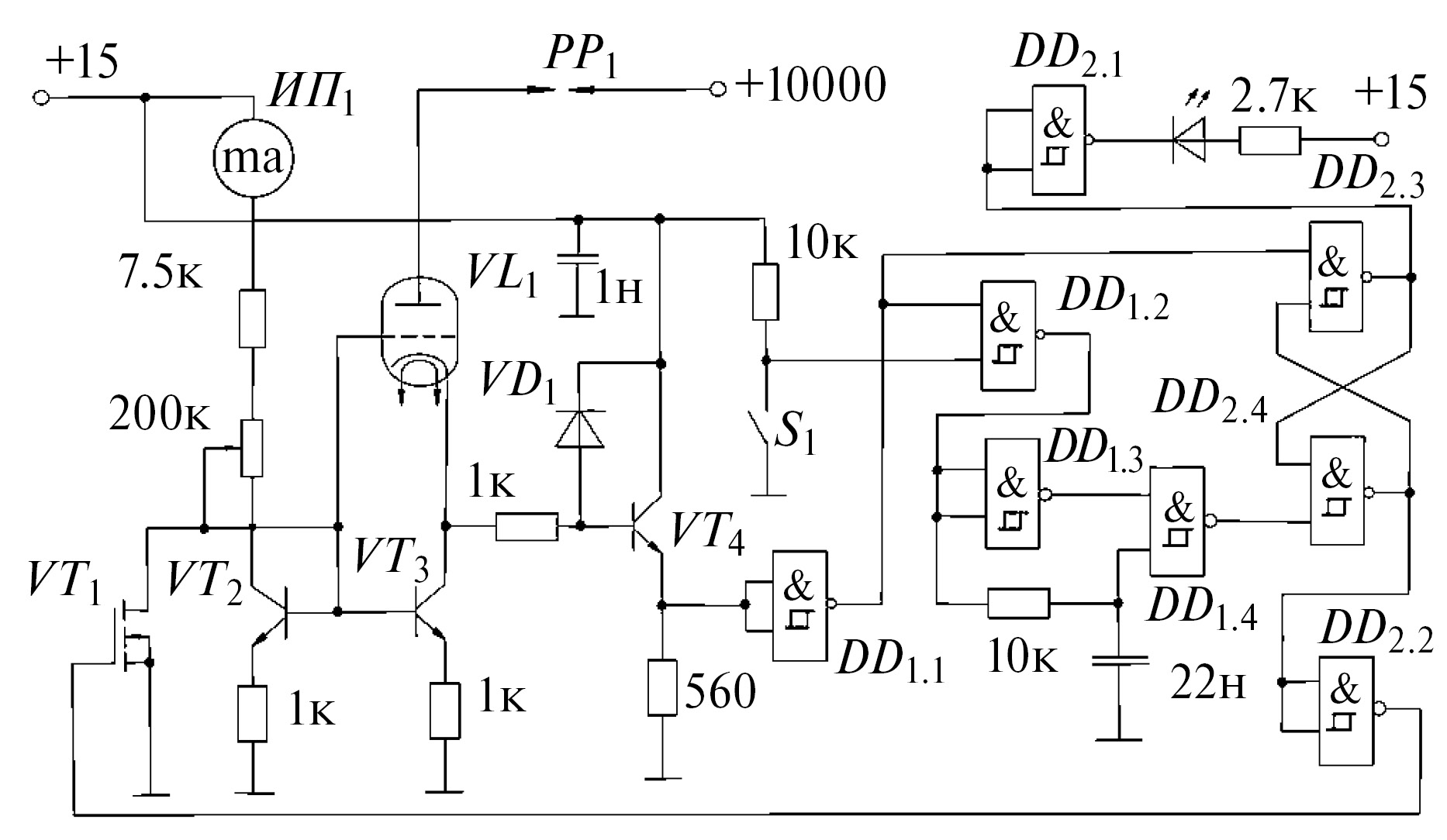 Рис. 1. Электрическая схема ограничителя тока высоковольтного пробоя: триод VL1 – ГП-5, транзистор VT1 – 12N10, транзисторы VT2, VT3 – кт940, транзистор VT4 – кт3102Д, диод VD1 – кд522, микросхемы DD1, DD2 – К1561ТЛ1.