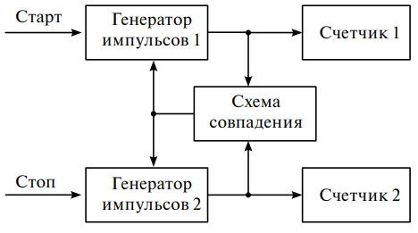1.2.1. Нониусный метод с использованием двух генераторов. Нониусный метод измерения временных интервалов [15] основан на применении двух генераторов тактовых сигналов с частотами f1 = 1/T1 и f2 = 1/T2 (рис. 1). Периоды генераторов различаются на небольшую величину τ = T1 – T2, которая определяет разрешение ВЦП. Генераторы 1 и 2 запускаются по фронтам импульсов на каналах Старт и Стоп соответственно. Количество импульсов n1 и n2 с выходов генераторов подсчитывается счетчиками. Генерация останавливается, когда схема совпадения обнаруживает совпадение фронтов импульсов генераторов. Измеренный временной интервал вычисляется по формуле