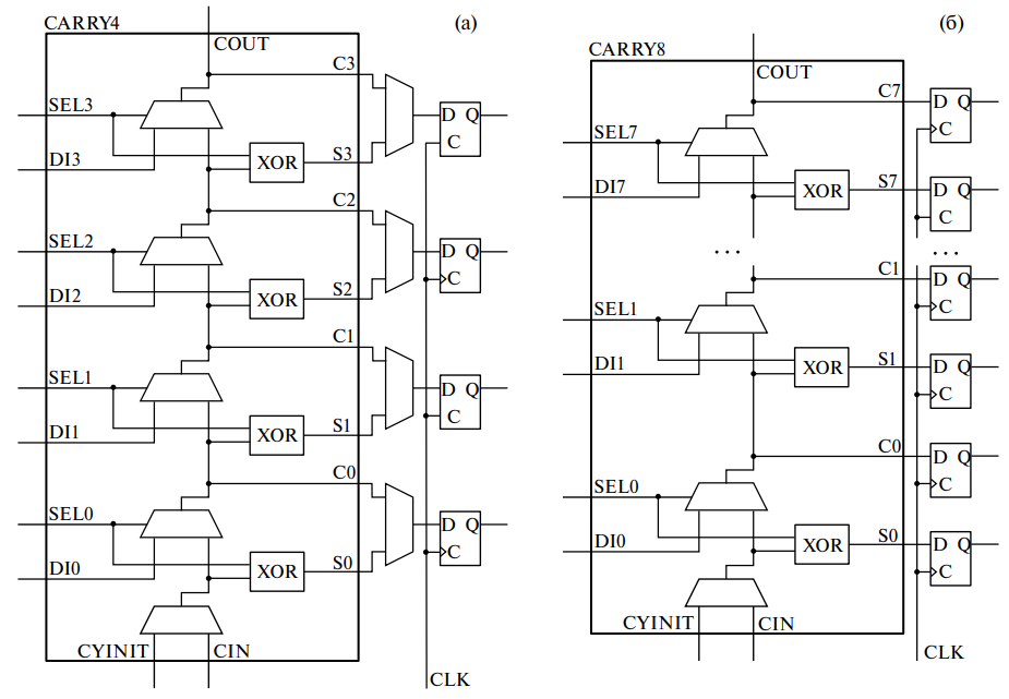 Рис. 4. Блоки ПЛИС фирмы Xilinx, на которых реализуется линия задержки: а – CARRY4, б – CARRY8.