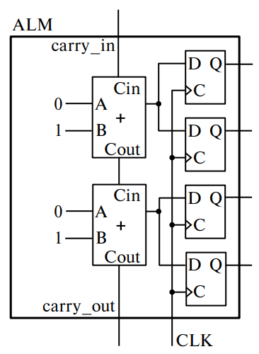 На ПЛИС фирмы Intel (Altera) линия задержки реализуется на основе цепи переноса разряда сумматоров (рис. 5). КЛБ включает 2 полных сумматора, выход каждого из которых может быть подключен к двум триггерам.