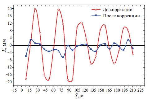 Прототип ПО разработан и успешно протестирован в сеансах пуско-наладочных работ №№ 3–4 на инжекционном комплексе коллайдера NICA. Проверена возможность длительной работы системы коррекции орбиты. Успешно проведена коррекция орбиты в статическом и динамическом режимах с помощью разработанных алгоритмов. В результате использования алгоритма статической коррекции на энергии инжекции с учетом ограничений на рабочие токи корректоров и выход из строя трех корректоров удалось скомпенсировать возмущения орбиты с 20 до 7 мм (рис. 3).