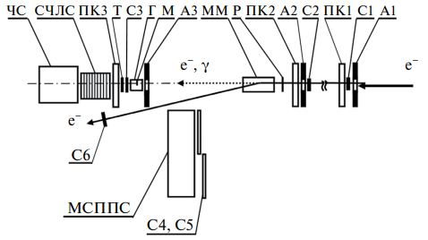 Рис. 3. Схема экспериментальной установки “Каскад”: А1–А3 и С1–С6 – сцинтилляционные счетчики, ПК1–ПК3 – пучковые пропорциональные камеры, Р – радиатор, ММ – магнит системы мечения фотонов, Г – гониометр, М – кристаллический конвертор, Т – сцинтилляционный счетчик для регистрации заряженных частиц ливня, СЧЛС – составной черенковский ливневый спектрометр, ЧС – черенковский спектрометр; МСППС – многоканальный свинцово-сцинтилляционный спектрометр полного поглощения.