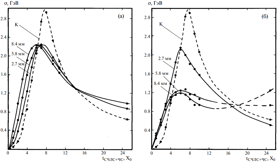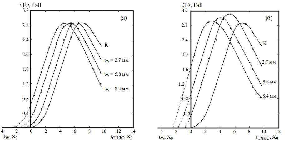 На рис. 5 приведены каскадные кривые развития электромагнитных ливней от электронов с энергией 26 ГэВ, выходящие из разориентированных (а) и ориентированных вдоль оси <111> (б) кристаллов вольфрама 2.7, 5.8 и 8.4 мм при комнатной температуре TW = 293 K, и далее продолжающих развиваться в СЧЛС [5]. На рисунке по оси абсцисс отложена толщина спектрометра СЧЛС (tСЧЛС) в радиационных длинах, по оси ординат отложена средняя энергия ливня (<∆E>), оставленная им в каждом счетчике спектрометра. Кривая K – калибровочная кривая, относится к отсутствию перед СЧЛС кристаллического конвертора. В этом случае начало развития ливня приходится на первый счетчик СЧЛС.