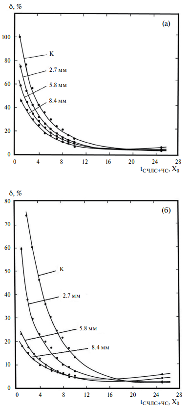Относительное энергетическое разрешение СЧЛС и суммарного спектрометра (СЧЛС+ЧС) δ = σ/ΔE (ΔE – доля энергии ливня, поглощенная спектрометром соответствующей толщины) в зависимости от толщины спектрометра и толщины кристалла, находящегося перед ним, при энергии электронов 26 ГэВ показано на рис. 7 и 8 соответственно [18].