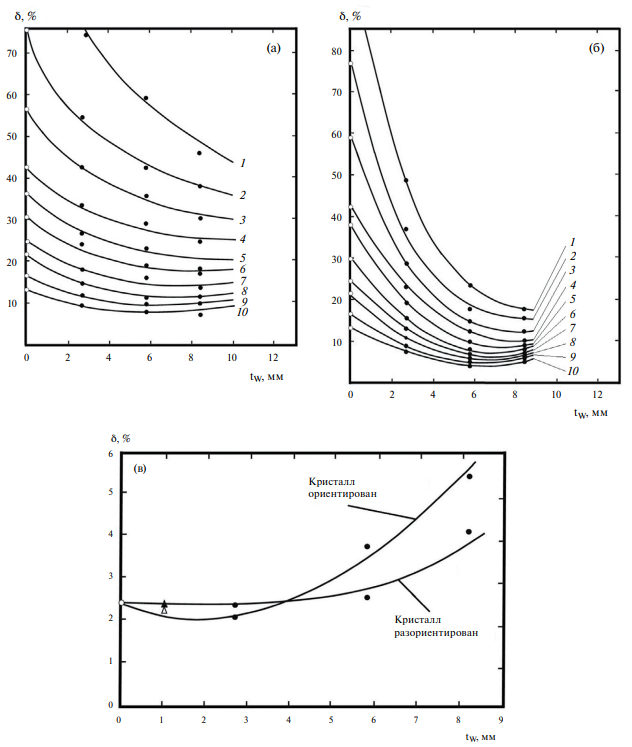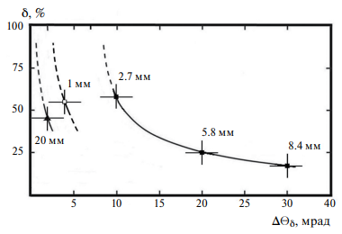 Для обоих типов кристалла видно существенное уменьшение δ при уменьшении угла ориентации. С увеличением толщины кристалла δ также улучшается, но при этом увеличивается ширина ориентационной зависимости ΔΘδ.