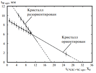 На рис. 8 видно, что при данной энергии пучка электронов при разориентированном и ориентированном состояниях конвертора существует некоторая оптимальная толщина кристалла (tWopt), соответствующая оптимальной толщине спектрометра (tCCopt), при которой относительное энергетическое разрешение спектрометра наилучшее δ = δmin. На рис. 9 представлено соотношение оптимальных толщин кристаллического вольфрамового конвертора перед спектрометром (tWopt)) и толщин спектрометра (tCCopt), при которых относительное энергетическое разрешение суммарного спектрометра наилучшее.