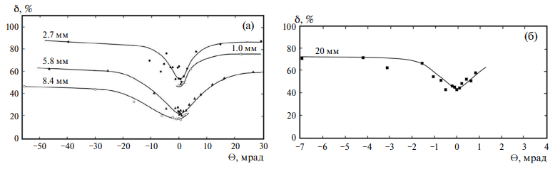 На рис. 10 показаны ориентационные зависимости δ при регистрации электромагнитных ливней первым счетчиком СЧЛС толщиной 1X0 для конверторов из кристаллов вольфрама (<111>) (а) и кремния (<110>) (б), полученные при энергии электронов 26 и 28 ГэВ.