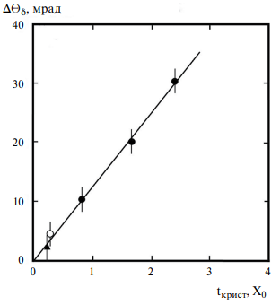 Рис. 11. Зависимость ширины ориентационной зависимости относительного энергетического разрешения ΔΘδ первого счетчика СЧЛС от толщины tкрист кристалов вольфрама (●, ○, <111>) и кремния (▲, <110>): ● – E = 26 ГэВ, TW = 293K; ○, ▲ – E = 28ЭГэВ, TW = 77K, TSi = 293K.