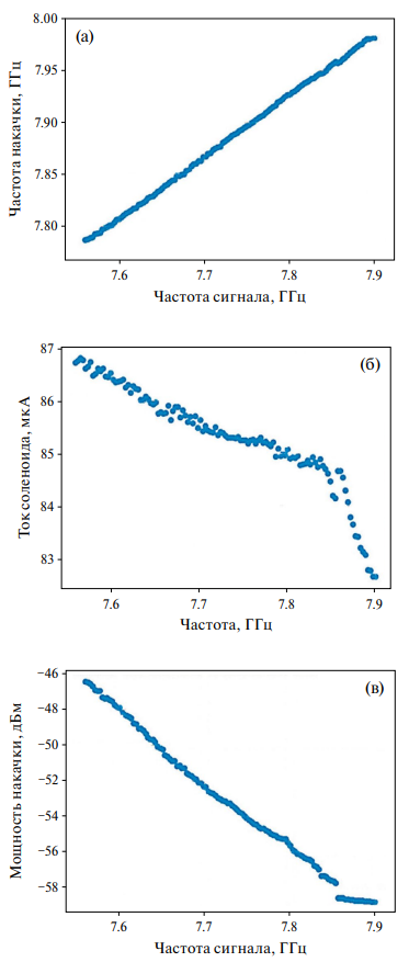 При использовании параметрического усилителя для единовременного дисперсионного считывания состояния кубита полоса усилителя должна значительно превышать полосу считывающего сигнала, которая, в свою очередь, определяется полосой считывающего резонатора. Поэтому оптимизация частоты и мощности накачки, а также тока соленоида должна проводиться для разных частот пробного сигнала, мощность которого соответствует мощности считывающего сигнала. В данном эксперименте оптимизация проводилась в диапазоне частот 7.4–8.2 ГГц с мощностью пробного сигнала –120 дБм. Для определения относительной величины отношения сигнал/шум проводилось многократное измерение коэффициента прохождения с помощью векторного анализатора цепей. Отношение сигнал/шум пропорционально стандартному отклонению этой величины. Результаты оптимизации параметров показаны на рис. 5. Как и ожидалось, для невырожденного усилителя частота накачки отличается от частоты сигнала на 150–200 МГц (рис. 5а).