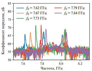 Полученная в эксперименте частотная зависмость коэффициента усиления (рис. 7) находится в хорошем соответствии с расчетным откликом для двухконтурной схемы невырожденного усилителя (рис. 4б). Частоты с максимальным усилением рис. 7 соответствуют частотам резонансных пиков рис. 4б.