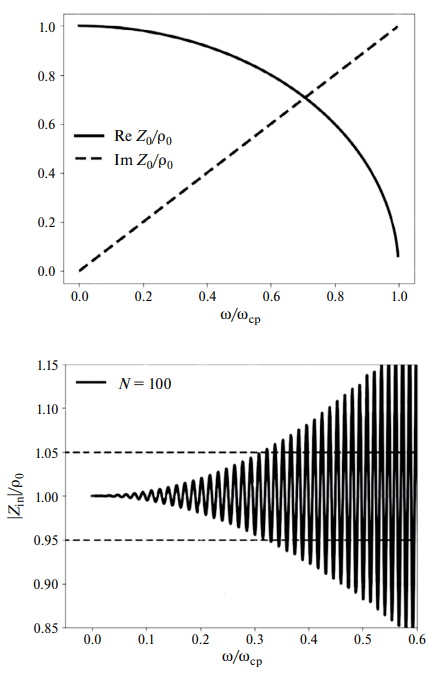 Рис. 2. Действительная и мнимая части импеданса непрерывной линии по простой формуле и расчет рассогласования импедансов дискретной линии с действительной нагрузкой [2].