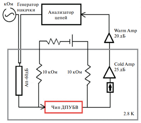 Снятие спектров пропускания чипа проводится с помощью отечественного векторного анализатора цепей Arinst VNA-PR1. В качестве генератора накачки использован НР8684В. Сигнал по коаксиальным кабелям идет внутрь криостата, он смешивается с волной накачки через тройник; далее волны попадают через холодный аттенюатор с суммарным ослаблением 60 дБ в чип усилителя; после прохождения волнами цепочки ячеек усилителя результат их взаимодействия попадает в вентиль и затем в холодный полупроводниковый усилитель (с усилением 25 дБ в диапазоне частот 2–6 ГГц); после выхода из холодной части сигнал попадает в теплый усилитель (с усилением 20 дБ до 6 ГГц) и возвращается в анализатор цепей. Чип также подключен через резисторы (по 10 кОм с каждой стороны) к разъему смещения и усиления на постоянном токе – это позволяет задавать смещение по постоянному току и снимать ВАХ-цепочки. На холодной пятке установки расположен также угольный термометр для измерения фактической температуры держателя образцов.