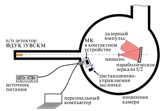 В качестве исследуемого объекта был выбран микроконтроллер (МК) с ARM-ядром. Исследуемый объект устанавливался внутри мишенной камеры на пути протонного пучка, эмитируемого с тыльной поверхности мишени в момент облучения лазерным импульсом. Микроконтроллер выполнен по технологии “объемный кремний” с топологической нормой 180 нм. Металлическая защитная крышка МК толщиной около 0.5 мм непрозрачна для ускоренных лазером протонов, поэтому она перед экспериментами была удалена механическим способом. Кристалл МК располагался на расстоянии 377 мм от мишени под углом 10° к ее нормали. Микроконтроллер устанавливался в контактное устройство, к которому через вакуумный разъем подключался источник питания и персональный компьютер для записи/считывания данных. Для защиты от электромагнитного импульса, возникающего на мишени во время лазерного выстрела, все электрические провода и контактное устройство внутри мишенной камеры были тщательно обернуты алюминиевой фольгой толщиной 15 мкм. Перед кристаллом МК был установлен фильтр из алюминиевой фольги толщиной 6 мкм. В ходе экспериментов исследовалось возникновение сбоев во встроенной памяти (ОЗУ) МК объемом 32 кБ. Перед каждым выстрелом лазера все ячейки ОЗУ инициализировались значениями 0xAAAAAAAA. Количество сбоев под действием ускоренных лазером протонов определялось при побитном сравнении массивов записанных перед экспериментом и считанных после эксперимента данных. Перед кристаллом МК внутри мишенной камеры была установлена дистанционно-управляемая заслонка из лавсановой пленки толщиной 400 мкм. Закрытая заслонка не пропускает протоны с энергиями менее 6 МэВ, но прозрачна для электромагнитного излучения, генерируемого в мишени во время выстрела. Исследования сбоев в МК проводились при полностью открытой заслонке. Однако в ходе экспериментов регулярно производились выстрелы при закрытой заслонке. В этих опытах при любых параметрах лазерного импульса сбои не наблюдались. Данный факт свидетельствует о том, что регистрируемые при открытой заслонке сбои вызваны именно ускоренными протонами.