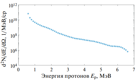 Рис. 2. Спектр протонов в эксперименте №804-04 при энергии лазерного импульса на мишени 1.60 Дж. Измерения выполнены под углом 10° к нормали мишени.