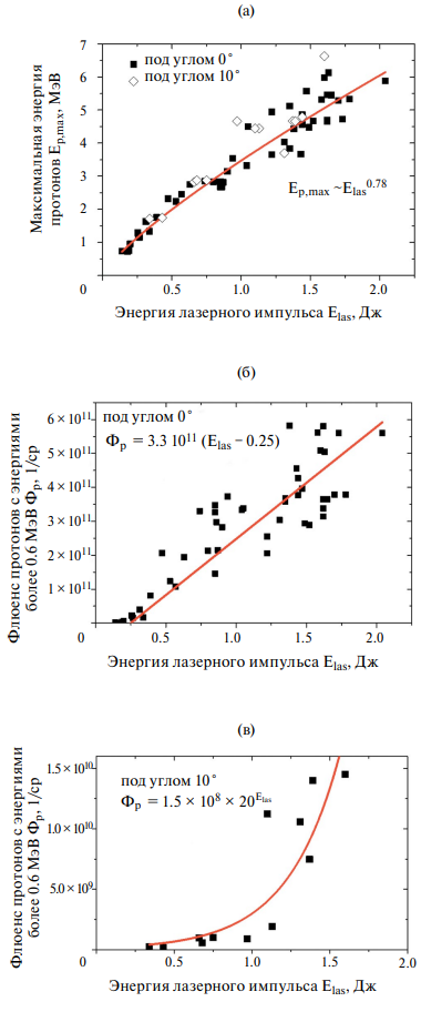 Максимальная энергия частиц при обоих углах наблюдения проявляет степенную зависимость от энергии лазерного импульса с показателем степени 0.8. Но флюенсы протонов зависят от энергии различным образом. Если в центре пучка (под углом 0°) количество частиц растет линейно с энергией лазерного импульса, то под углом 10° наблюдается более резкий экспоненциальный рост. Этот факт, вероятно, связан с увеличением углового раствора пучка протонов при росте энергии лазерного импульса.