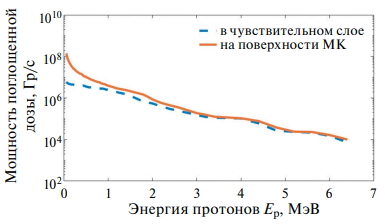 Рис. 5. Зависимость мощности поглощенной дозы на поверхности МК и в чувствительной области (на глубине 10.6 мкм) от энергии протонов. Расчет выполнен для спектра протонов, зарегистрированного в эксперименте №804-04 (см. рис. 2).