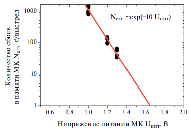 Для того чтобы оценить вклад объемных радиационных эффектов, была проведена серия экспериментов, в которой измерялась чувствительность МК к сбоям при различных напряжениях питания. В этой серии, чтобы не допустить слишком большого количества ошибок при малых напряжениях, перед микросхемой была установлена свинцовая пластина толщиной 500 мкм с отверстием диаметром 1 мм напротив центра кристалла МК. Отверстие было закрыто алюминиевым фильтром толщиной 6 мкм. Для анализа были выбраны данные экспериментов, в которых энергия лазерного импульса была примерно одинаковой (от 1.4 до 1.7 Дж). Измерения показали, что чувствительность МК к протонам лазерного ускорителя растет экспоненциально при снижении напряжения питания (см. рис. 6). Это свидетельствует о том, что регистрируемые сбои носят характер одиночных радиационных эффектов. Снижение напряжения питания на 0.16 В приводит к увеличению чувствительности МК к ОРЭ в 5 раз.