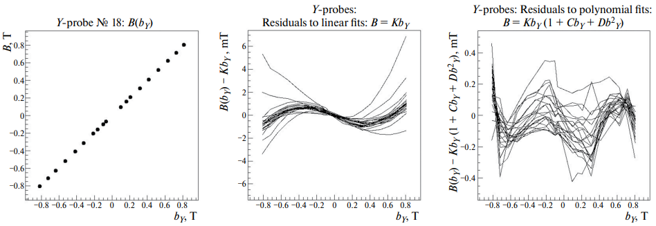 Визуально зависимость B(bY) очень близка к линейной. Однако подгонки этих характеристик линейными функциями для всех двадцати двух Y-датчиков дают картину невязок, показанную в средней рамке, на которой отчетливо видно систематическое поведение отклонений с изменением величины поля. Для большинства датчиков величина этих отклонений укладывается примерно в ±2 мТл. Но для нескольких датчиков отклонения в 2–3 раза больше. В правой рамке рис. 3 показаны подобные же невязки, но после фитирования тех же зависимостей полиномами более высокого порядка: