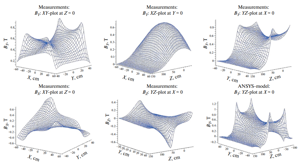 В центральной полосе вдали от полюсов среднеквадратичное отклонение (RMS) расчетов и измерений по двум поперечным компонентам дает оценку погрешности измерений δB ≈ ±0.95 мТл, т. е. примерно ±0.18% от индукции 0.54 Тл в центре магнита, а по всему измеренному объему δB ≈ ±1.9 мТл ≈ ±0.35%. Ухудшение RMS около полюсов связано с более высокой чувствительностью там к позиционированию датчиков, а также с ухудшением точности расчетов вблизи острых ребер и углов ферромагнитных полюсов. Включение в подгонку продольной компоненты BZ еще несколько ухудшает цифры по δB: примерно до ±1.1 и ±2.3 мТл соответственно. Здесь главным виновником является, по-видимому, повышенная чувствительность расчетной BZ к граничным условиям в области защитных экранов, особенно переднего, расположенного близко к центру магнита и частично перекрывающего его апертуру. Однако и требования к точности знания компоненты BZ сильно пониженные, поскольку ее вклад в отклонение вторичных заряженных частиц пропорционален квадрату угла вылета частицы относительно исходного пучка, что даже на границе аксептанса установки ±110 мрад дает ослабление требований к точности измерений BZ почти в 100 раз в сравнении с двумя другими компонентами.