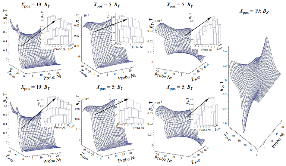 Для оценки стабильности измерительных каналов и позиционирования кассеты прогоны для нескольких одних и тех же значений X-координаты были повторены по 2–3 раза: в начале, в середине и в конце цикла измерений. Вариации чувствительности каналов оценивались из сравнения показаний датчиков Холла в области экстремумов зависимостей B(Z) для соответствующих компонент индукции, где производная dB/dZ близка к нулю. Оцененная таким образом стабильность каналов измерений оказалась очень хорошей: вариации показаний не превышали ±0.2 мТл, что составляет менее ±0.04% от величины поля в центре магнита.