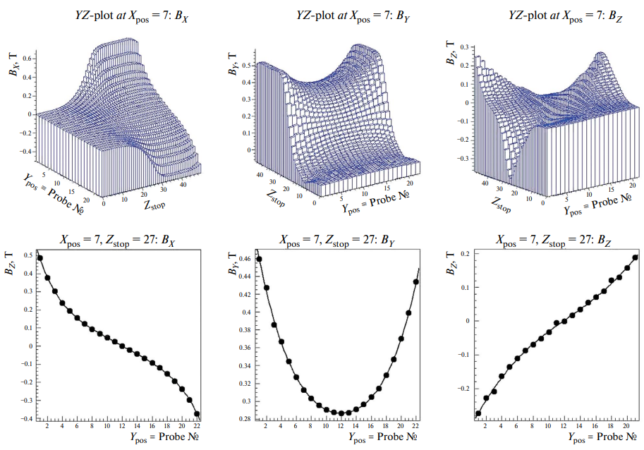 На следующем этапе была осуществлена подгонка расчетов и измерений методом наименьших квадратов с использованием двадцати четырех свободных параметров: 23 геометрических, таких как три шага измерительной решетки; три относительных сдвига координат; углы между осями и поправки на отклонения их от прямолинейности; углы ориентации средних по датчикам плоскостей измерения в расчетной системе и др. плюс абсолютная нормировка величины индукции. Были рассмотрены несколько вариантов подгонки: по всему измеренному объему – всего 101920 пар чисел для сравнения; по центральной полосе |Y| < 30 см, все точки которой удалены от полюсов не менее, чем на 20 см, – 70560 пар чисел; по центральной выборке с участием только двух поперечных компонент индукции BX и BY – 47040 пар чисел.